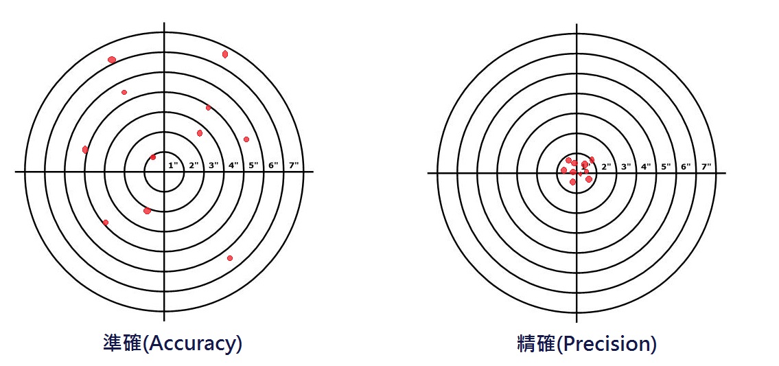 除了精確(Precision)還有一個叫準確(Accuracy)那我們來提一下這兩個名詞的區別 我們以打靶上的靶紙作為解說例子如下圖,紅色為射擊點,您可以在左圖中看到射擊點都有落在目標物靶紙圓上這就是準確,然而右圖是射擊點都集中在某處(當然不一定都要圓心,只要夠集中就好)這就是準確。
