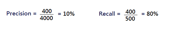假設在資料庫有1000筆資料,和美食有關文章有500篇,使用者在輸入美食關鍵字後,回傳的文章有4000篇,其中有400篇是和美食有關的,請求出精確率(Precision)和召回率(Recall)。