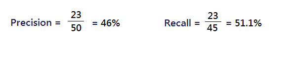 資料庫有500筆資料,符合需求的原有45筆,如果查詢筆數設定輸出50筆時,有23筆符合需求,請求出精確率(Precision)和召回率(Recall)。